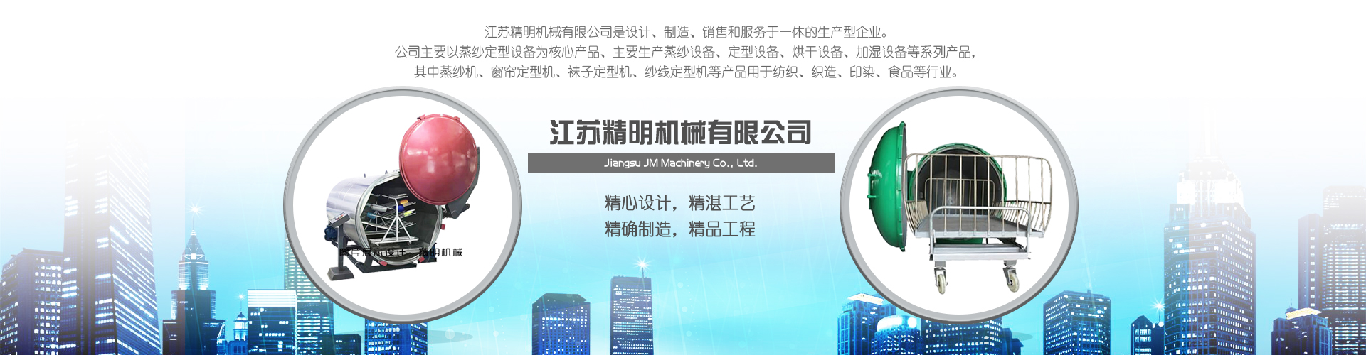 江蘇精明機械有限公司是設計、制造、銷(xiāo)售和服務(wù)于一體的生產(chǎn)型企業(yè)。公司主要以蒸紗定型設備為核心產(chǎn)品、主要生產(chǎn)蒸紗設備、定型設備、烘干設備、加濕設備等系列產(chǎn)品,其中蒸紗機、窗簾定型機、襪子定型機、紗線(xiàn)定型機等產(chǎn)品用于紡織、織造、印染、食品等行業(yè)。主要經(jīng)營(yíng)包括:1、蒸紗設備:蒸紗機、蒸紗箱、蒸紗缸、蒸紗鍋、蒸紗小樣機等2、定型設備:窗簾定型機、襪子定型機、圍巾定型機、手套定型機、紗線(xiàn)定型機、低彈絲定型機、丙綸絲定型機等3、烘干設備:布料烘干機、拉幅烘干機、染整烘干機等4、加濕設備:棉紗加濕機、氣流紡...
